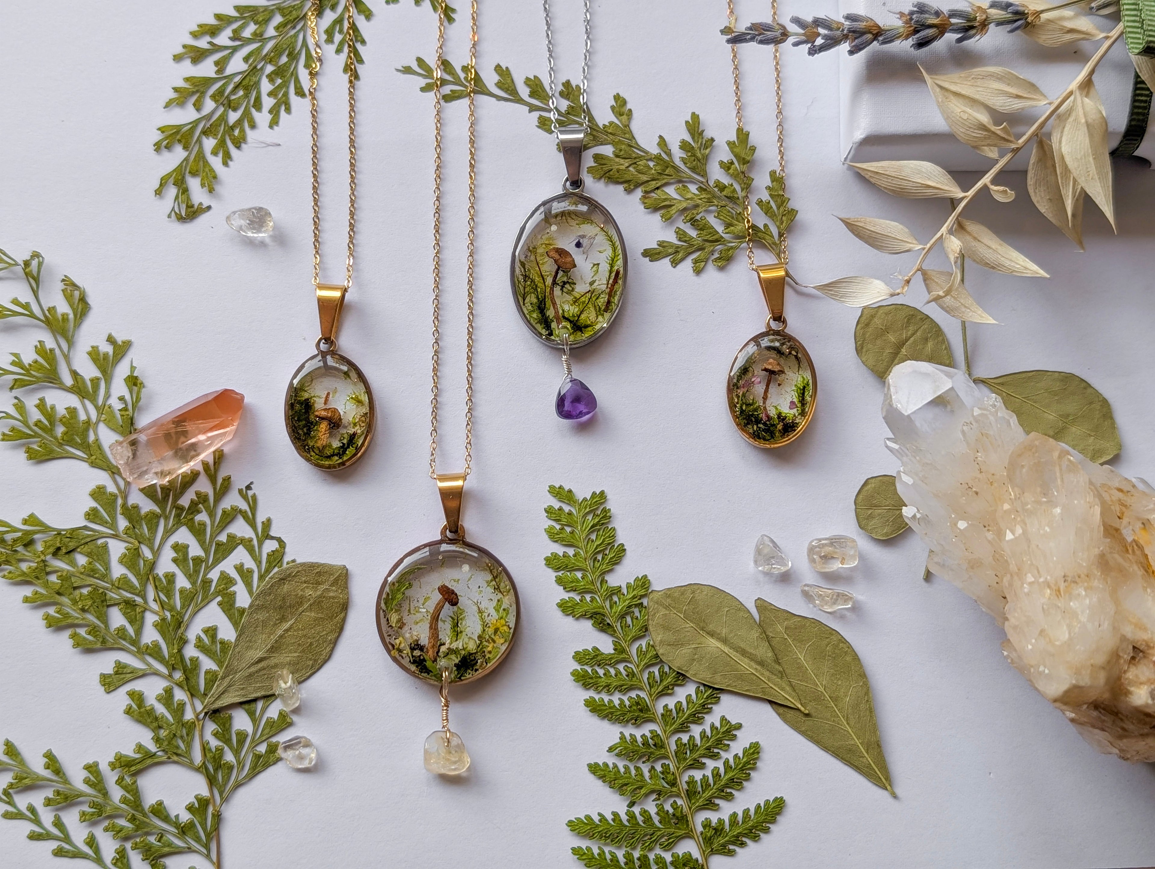 Explore our collection of Real Mushroom & Foliage Necklaces - Each being one of its kind, completely unique - a real magical piece of nature for you to wear.