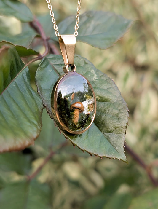Pixie Forage Pendant - Real Mushroom & Moss Stainless Steel Necklace